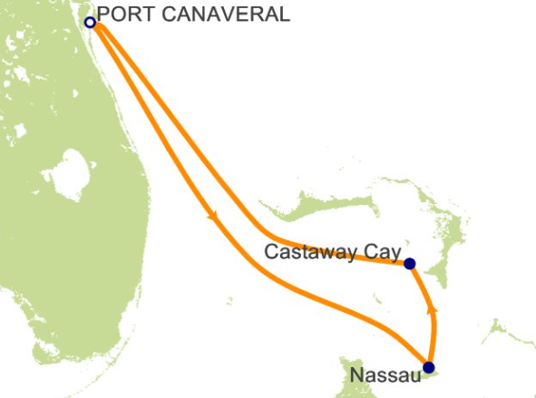 • 기항지: 포트 커내버럴 ➔ 나쏘(Nassau) ➔ 캐스타웨이 케이(Castaway Cay) ➔ 포트 커내버럴 (※ 6/22 출발 항차는 ‘더블 아일랜드(두 전용 섬)’ 코스로 진행됩니다!)